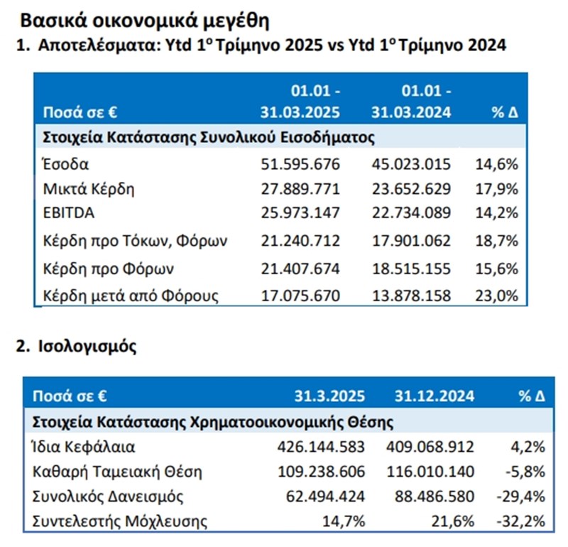 Ειδικότερα, όπως αναφέρει σχετικά, τα βασικά χαρακτηριστικά του 1ου τριμήνου του 2025 διαμορφώνονται ως εξής: