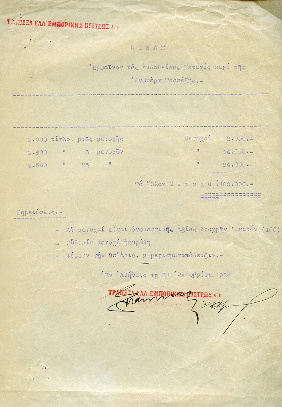 Αυτή η πεποίθηση υλοποιήθηκε στις 2 Νοεμβρίου 1925, όταν αποφασίστηκε η επίσημη εισαγωγή των μετοχών της Τράπεζας στο Χρηματιστήριο Αξιών Αθηνών, "υπό τον όρον όπως αι εξ αυτών πράξεις γίνονται μόνο της μετρητοίς". Αυτή η ημερομηνία σηματοδοτεί την έναρξη μιας αδιάσπαστης, αιώνιας σχέσης, μιας συνεχούς παρουσίας που εκτείνεται για έναν ολόκληρο αιώνα και συγχωνεύεται με τις ίδιες τις αναπτυξιακές παλμικές πτώσεις της ελληνικής οικονομίας. Ήταν η επίσημη αναγνώριση της τράπεζας ως εισηγμένης εταιρείας στο χρηματιστήριο, με όλες τις ευθύνες και τις ευκαιρίες που αυτό συνεπαγόταν."
