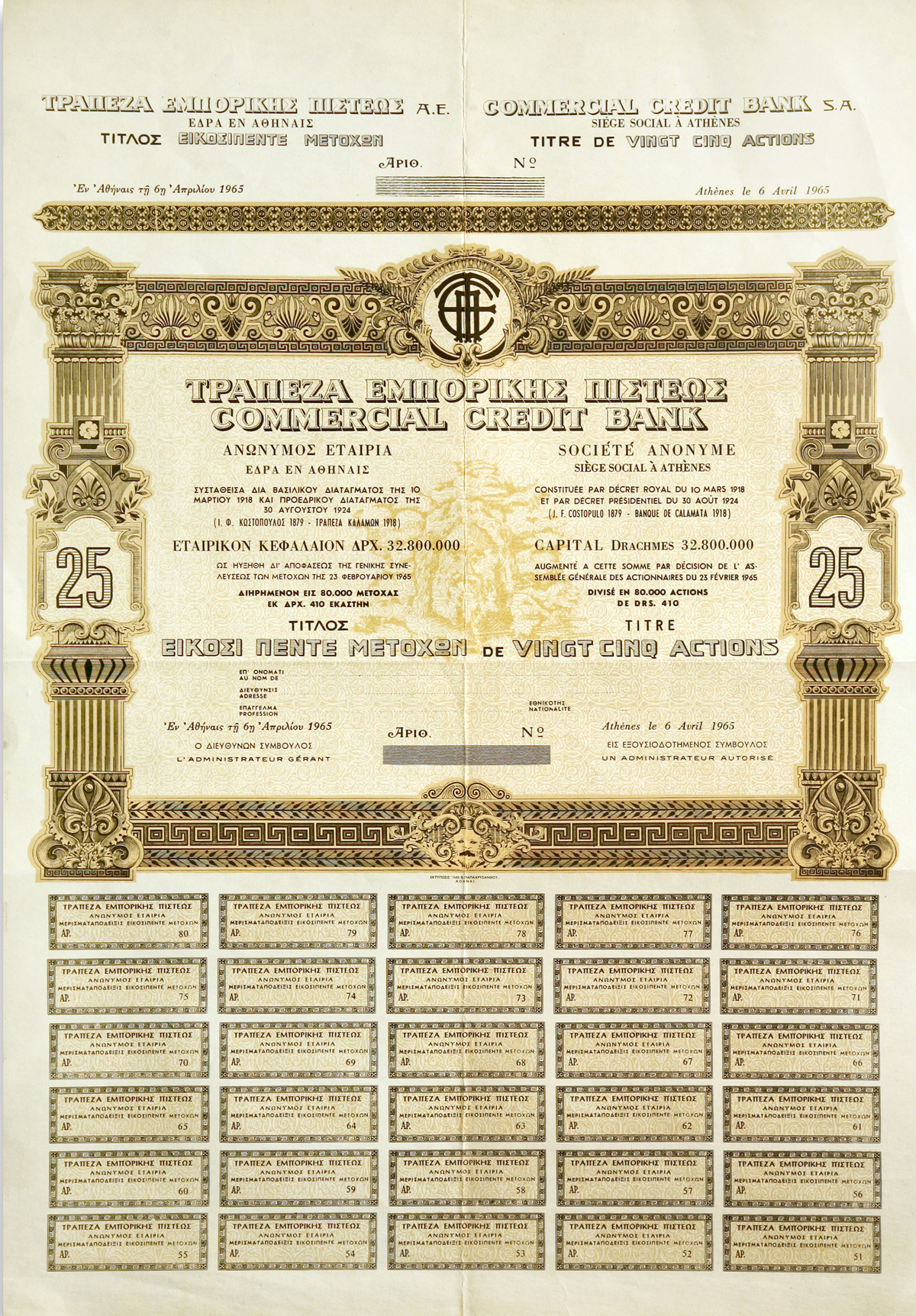 Το μετοχικό κεφάλαιο της νέας αυτής τράπεζας, ύψους 10 εκατομμυρίων δραχμών και διαιρεμένο σε 100.000 μετοχές, αποκάλυπτε από την αρχή μια προοδευτική και δημοφιλή φιλοσοφία. Οι ιδρυτές στόχευαν να εμπλέξουν το ευρύ κοινό στην οικονομική προσπάθεια, βασιζόμενοι στο όραμα ότι το Χρηματιστήριο θα αποτελέσει τον κύριο άξονα άντλησης κεφαλαίων. Η επιλογή αυτή αποτελούσε μια σύγχρονη, για τα τότε ελληνικά δεδομένα, προσέγγιση που απέκλινε από το κλειστό μοντέλο οικογενειακών τραπεζών και ενέκρινε μια πιο ανοιχτή και δημοκρατική μορφή χρηματοδότησης.